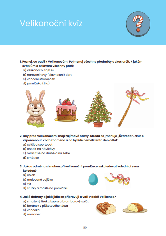 Dále kniha zahrnuje jednoduché recepty na tradiční i netradiční velikonoční pokrmy a pochoutky, které můžete využít při školních aktivitách nebo jako nápady na společné tvoření s rodiči a dětmi doma. Nechybí ani návody na výrobu velikonočních dekorací, kraslic a dalších doplňků, které rozzáří nejednu třídu.