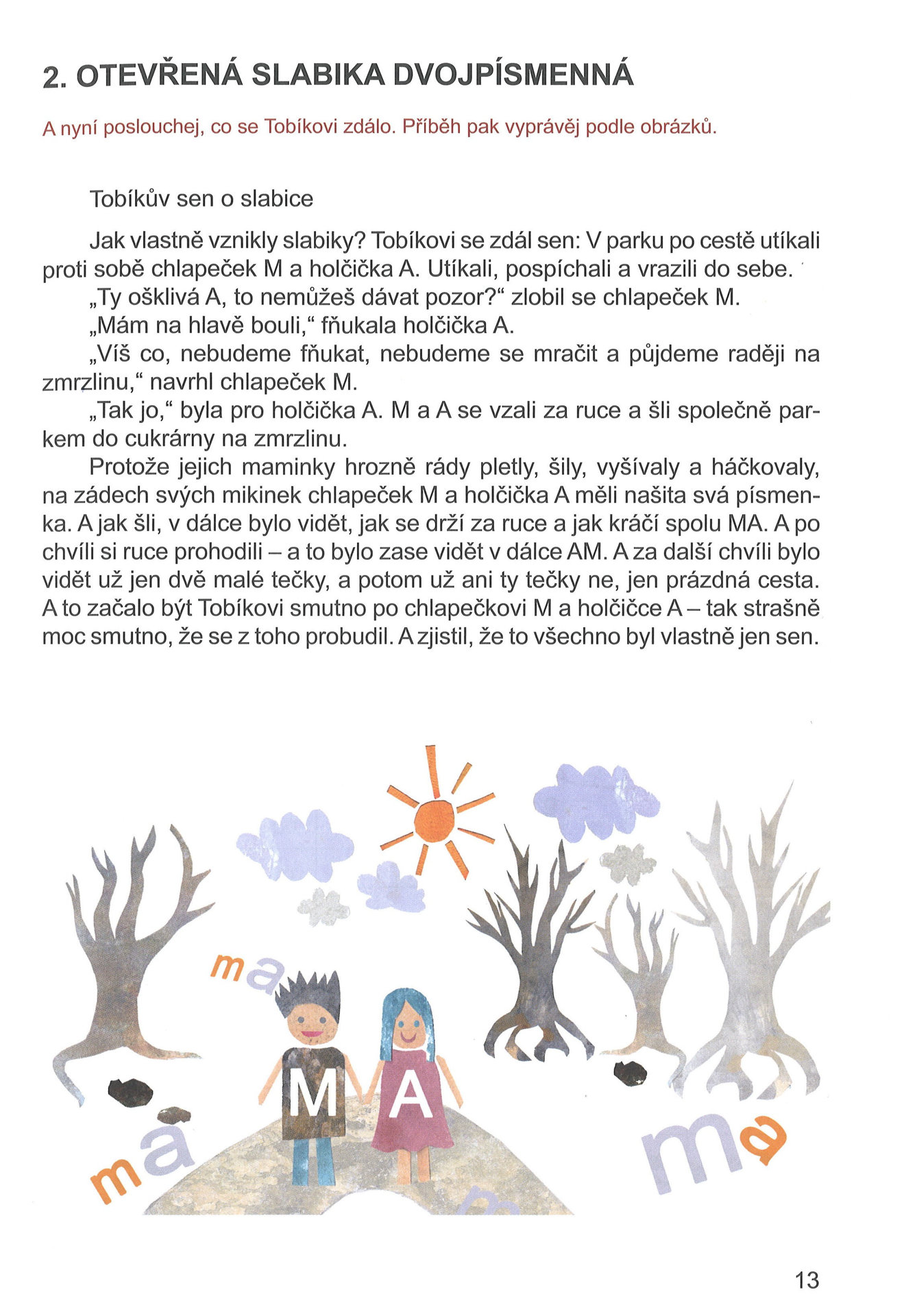 Značnou část učebnice tvoří práce s písmenem a slabikou. Úkoly posilují práci obou mozkových hemisfér. Z obsahového hlediska je systematicky pracováno s otevřenou slabikou, zavřenou slabikou dvojpísmenou, otevřenou slabikou ve slovech dvojslabičných a zavřenou slabikou na konci slov. Učebnice poslouží dětem 1. tříd jako doplněk slabikáře, dále je určena dyslektikům (konec 1. třídy, 2. třída, příp. 3.) pro zvládnutí uvedených partií a všem dětem s obtížemi i charakteru nedyslektického. Je vhodná i pro čtení ve školách zvláštních, a to od 2. třídy.