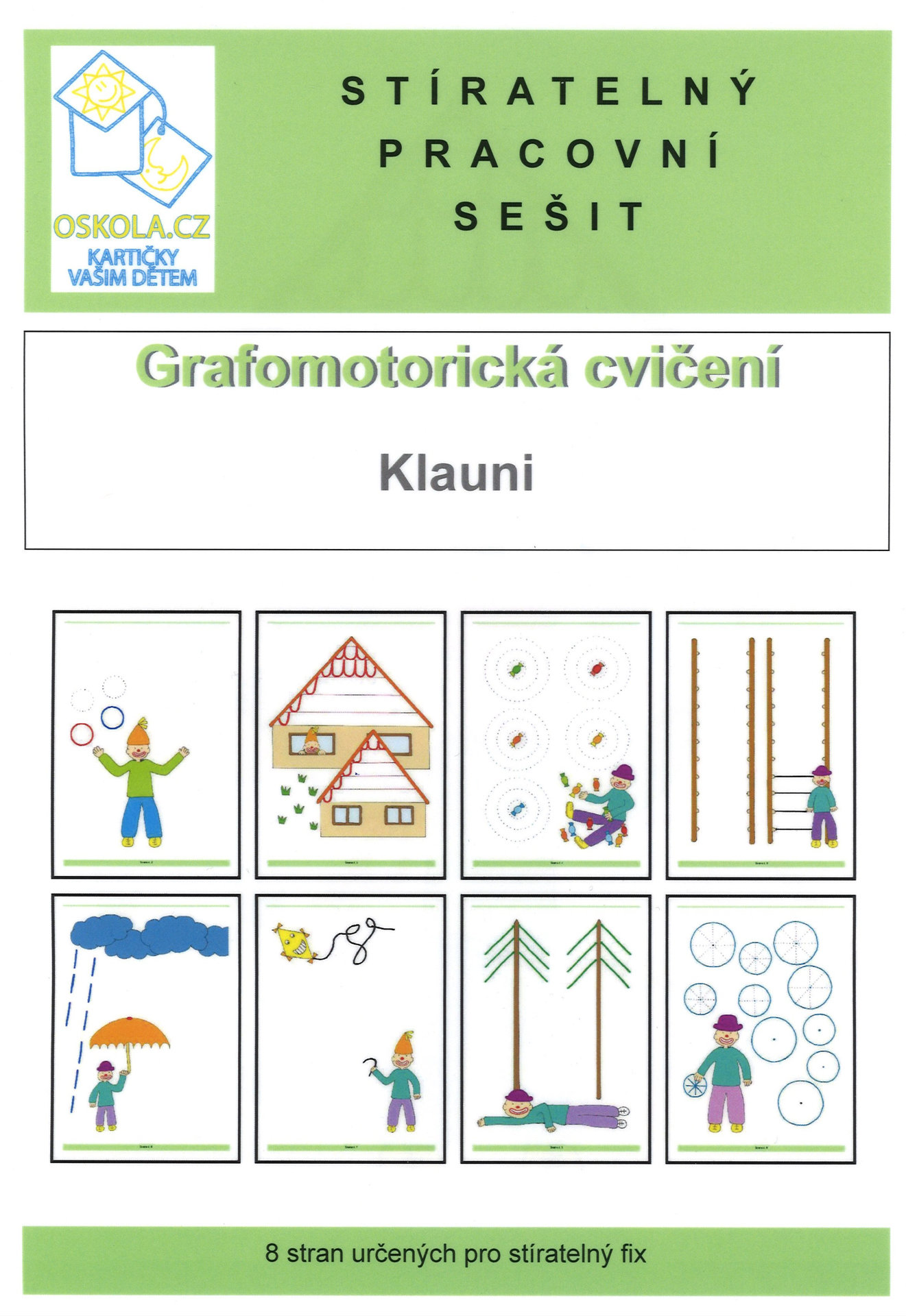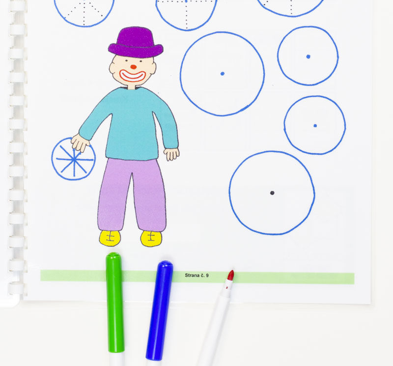 Stíratelný pracovní sešit s plastovou vazbou obsahuje 8 stíratelných stránek. Stránky jsou zalaminované do tvrdé folie, určené ke psaní a kreslení stíratelnými fixami. Tento sešit dává dětem první grafomotorické návyky zábavnou formou s klauny.