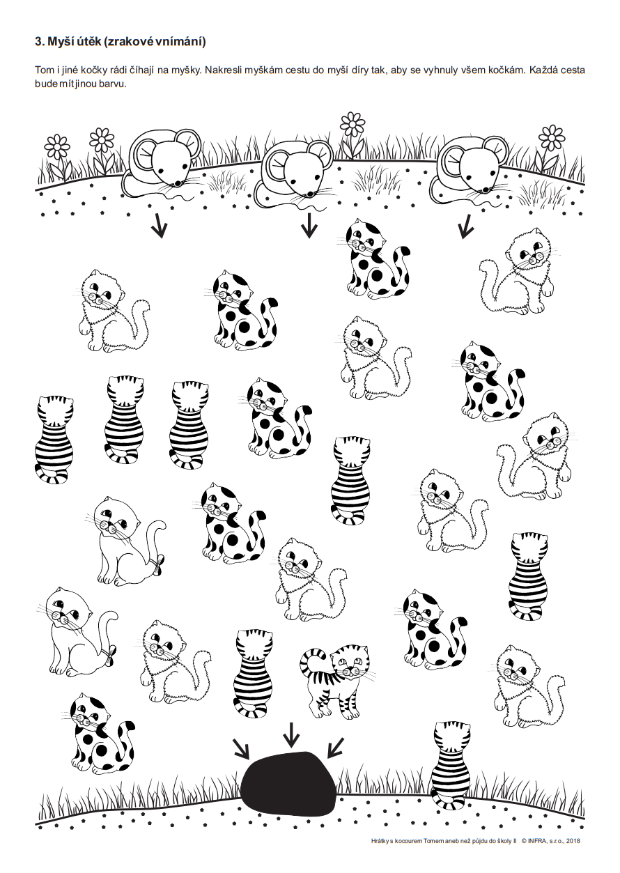60 pracovních kopírovatelných listů se zaměřuje především na sluchové a zrakové vnímání, podporu předpočetních představ, zrakové paměti a pozornosti. Tyto nové pracovní listy představují již náročnější varianty a obměny téhož zadání úkolu. Děti na pracovních listech opět doprovázejí oblíbení kočičí kamarádi v čele s kocourem Tomem. Obrázky kocouří party nejen děti motivují k vlastní činnosti s pracovním listem, ale nabízejí možnost si obrázky vymalovat a vytvořit si krásné, barevné ilustrace.