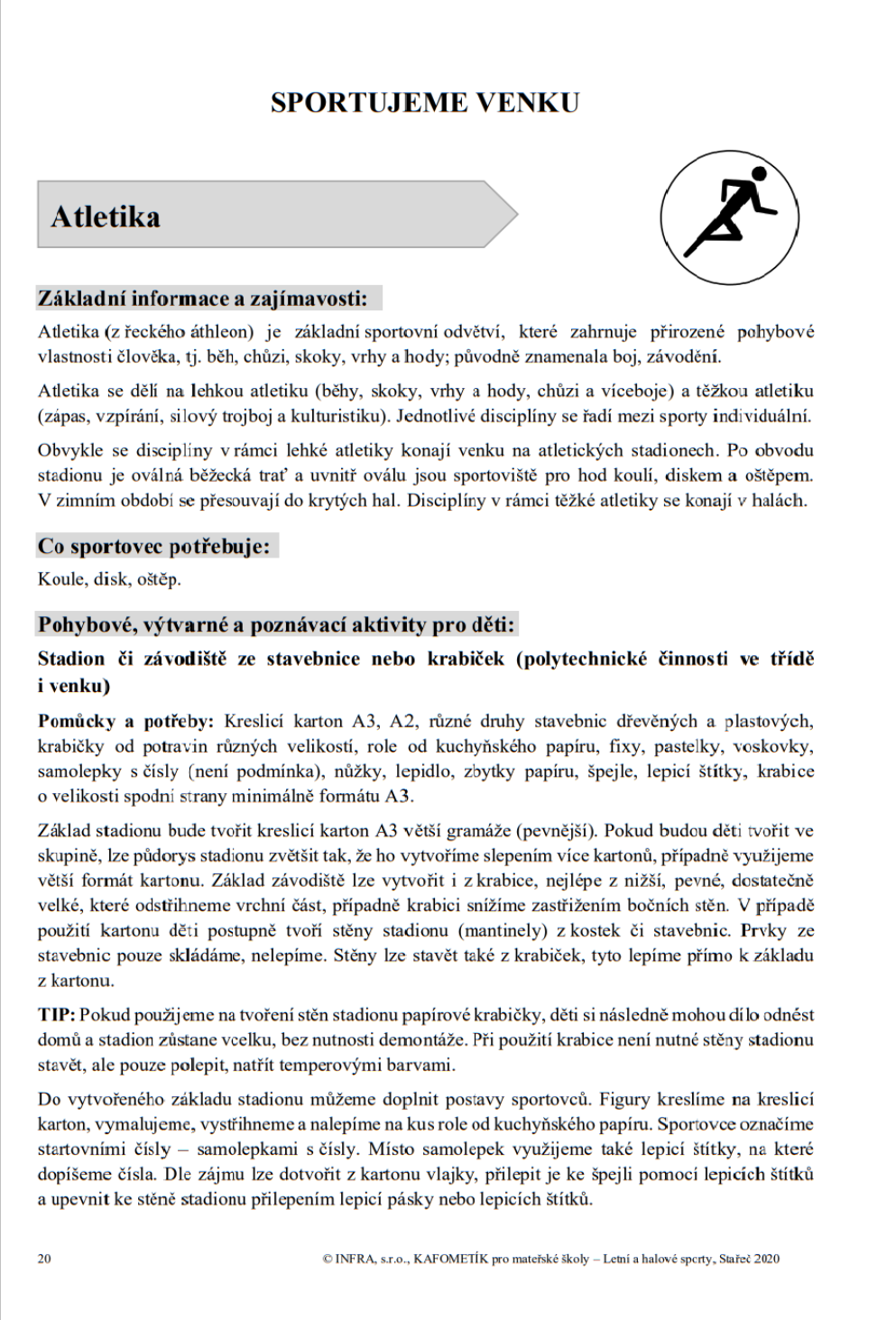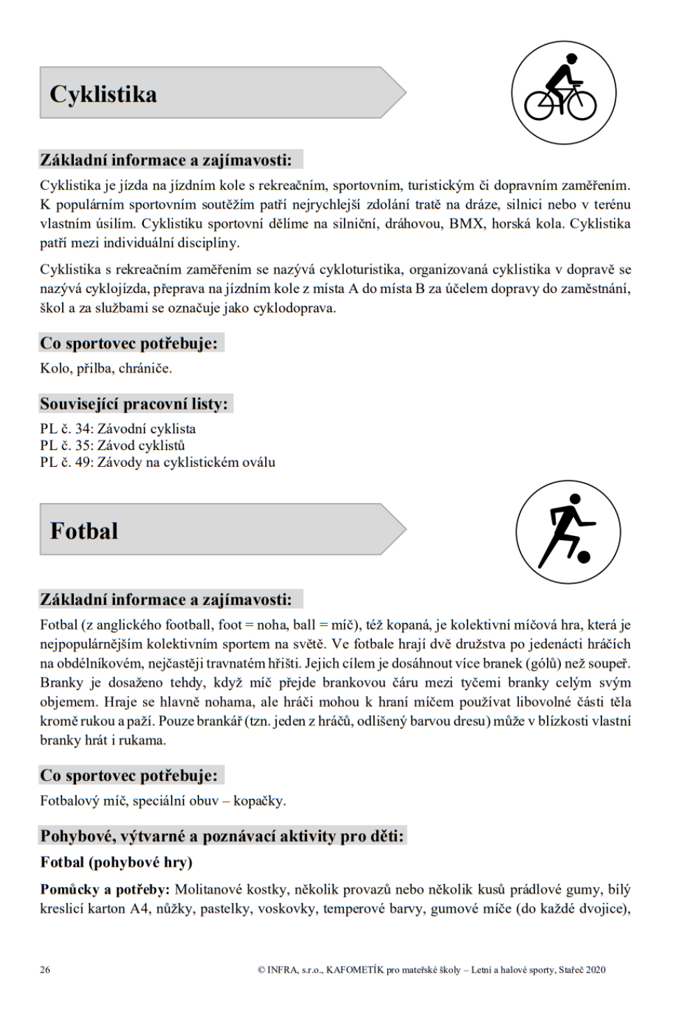 KAFOMETÍK LETNÍ A HALOVÉ SPORTY je desátým dílem ze známé řady tematických publikací s pracovními listy a metodikou. Tento díl KAFOMETÍKU jsme věnovali sportování. Jeho prostřednictvím chceme vám i dětem přiblížit co nejvíce sportů, i těch méně známých. A protože sportů je hodně, v tomto díle se budeme věnovat letním a halovým sportům. Jedním z nejvýznamnějších sportovních událostí jsou olympijské hry, konané jednou za 4 roky. Proto jsme téma olympijských her zařadili do příběhů a v metodice se věnujeme letním a i olympijským sportům.
