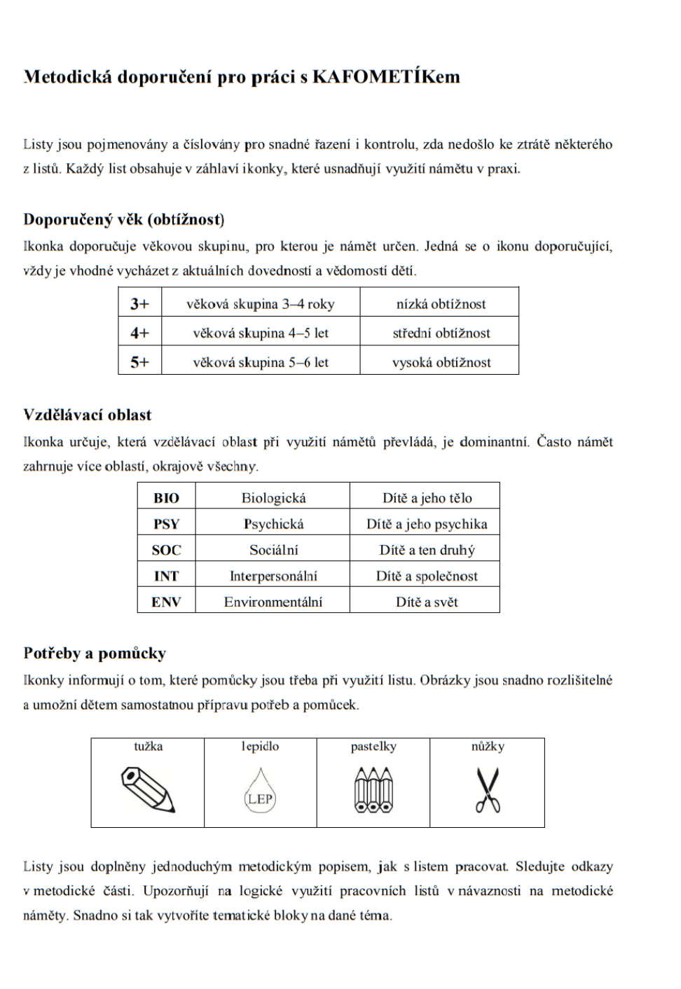 Z jednotlivých listů si snadno sestavíte vlastní tematický celek nebo projekt, který bude odpovídat zájmům a potřebám Vašich dětí. K jednoduché manipulaci se souborem přispívá i volné řazení listů, což umožňuje jejich snadné kopírování. Jednotlivé náměty jsou využitelné po celý školní rok a podporují nenásilně také fantazii a představivost dětí. Práci s listy vám usnadní jednoduché grafické ikonky.Poskytují informaci o věkové skupině, pro kterou je námět určen, současně také upozorňují na vzdělávací oblast, které se námět nejvíce dotýká, ikonky znázorňující druhy pomůcek, které si můžete připravit předem. Předložené náměty rozvíjejí matematickou i čtenářskou gramotnost, řeč, základní vědomosti týkající se přírody a přírodního prostředí, jemnou motoriku, pohybové dovednosti, fantazii a představivost. Získáte tak ucelený metodický materiál pro mnohostranné použití v praxi pedagoga.