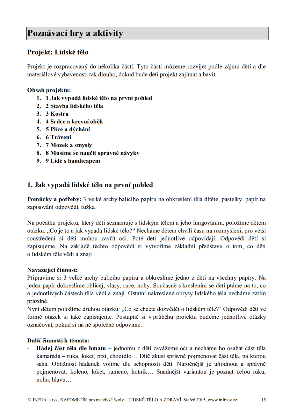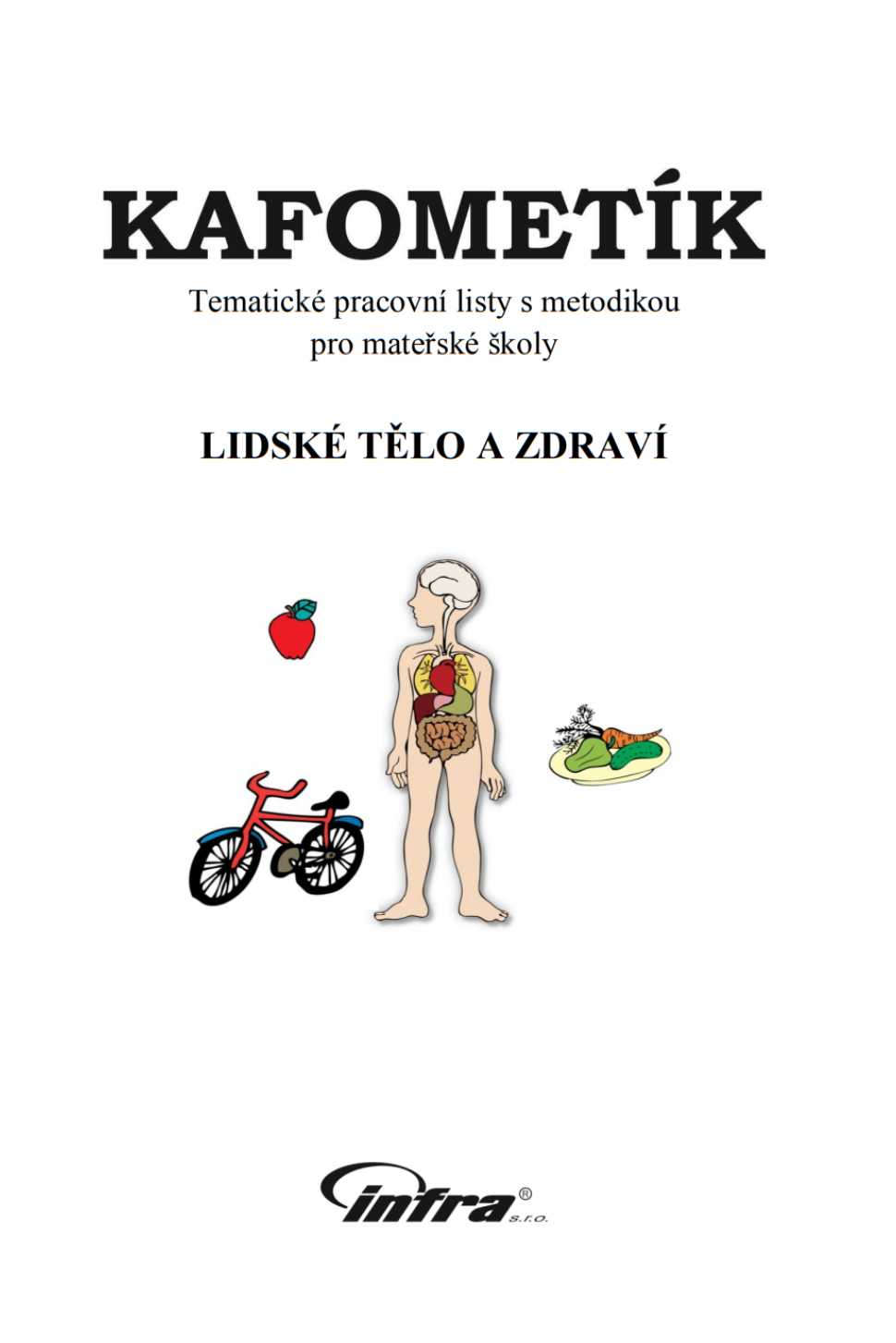KAFOMETÍK LIDSKÉ TĚLO A ZDRAVÍ je již pátým dílem této úspěšné řady. KAFOMETÍK - je soubor tematických pracovních listů s metodikou zaměřených na všechny oblasti dle RVP PV a také metodické náměty pro činnosti a aktivity z oblasti poznávací, pohybové a výtvarné, čímž tvoří ucelený metodický materiál pro mnohostranné použití v praxi pedagoga. V metodické části najdete spoustu her a aktivit, pomocí kterých budou děti poznávat lidské tělo, jeho anatomickou skladbu a také to, co všechno naše tělo potřebuje a co mu škodí. Na pracovních listech si mohou své vědomosti procvičovat a zábavnou formou vštěpovat zdravé návyky.