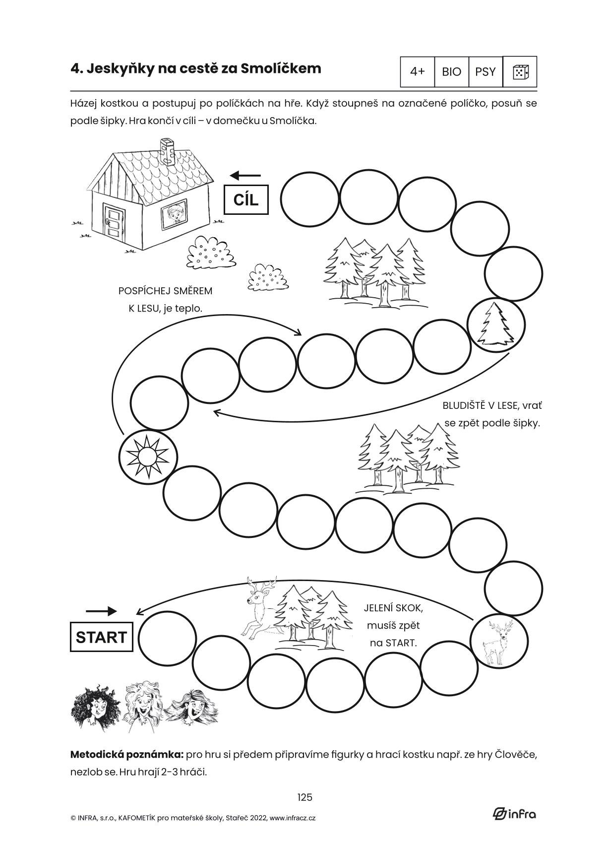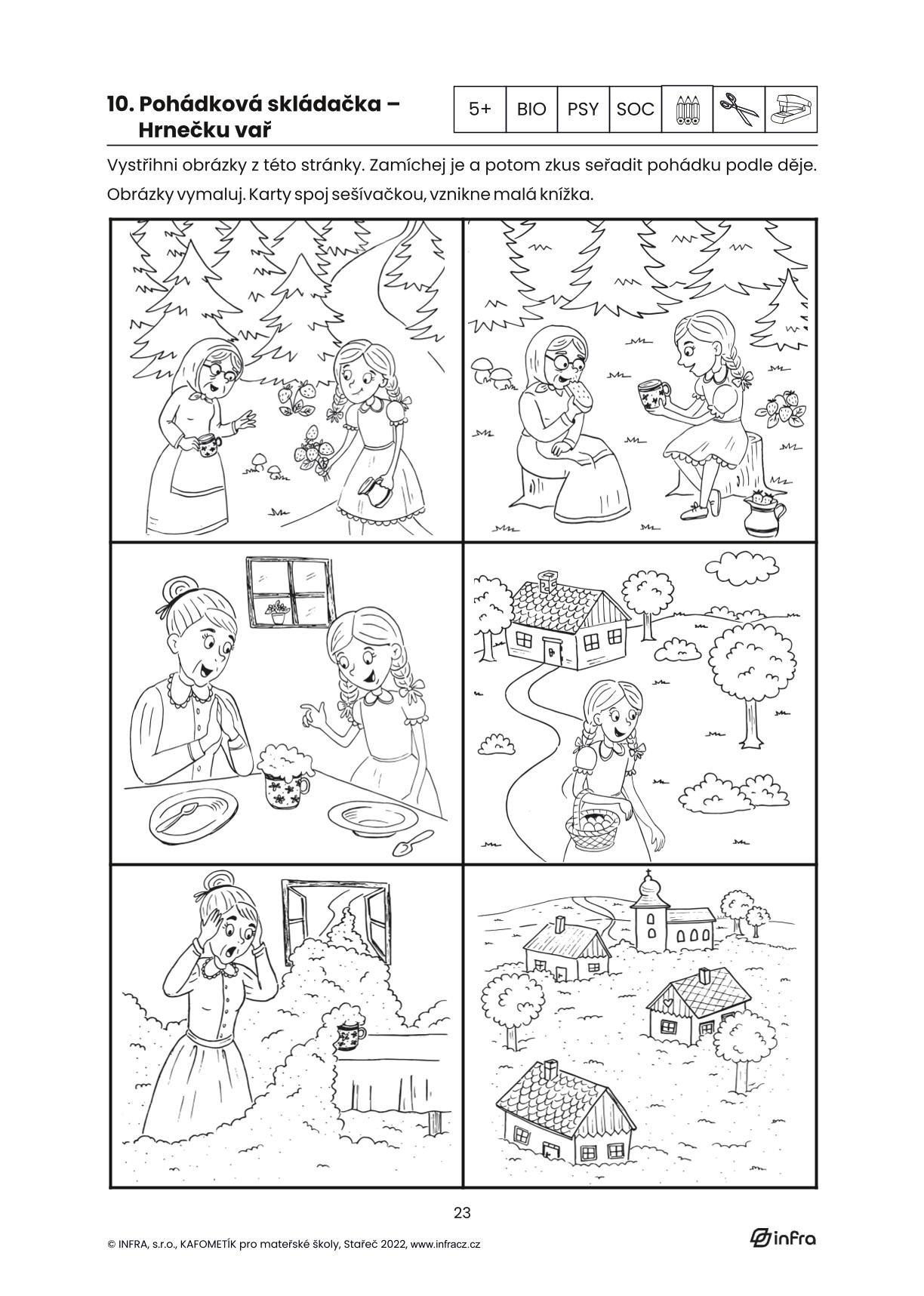 KAFOMETÍK jsme tentokrát rozdělili na kapitoly dle pohádek. Jednotlivé kapitoly začínají úvodní pohádkou, se kterou nadále pracujeme v metodice s doporučením výtvarných a pohybových aktivit. Každá kapitola obsahuje několik básniček a písniček inspirovaných pohádkou, dále malované čtení a 10 pracovních listů pro děti od 3-6 let. Jednotlivé pohádky tak tvoří tematický celek. Děti si pomocí pracovních listů procvičí grafomotorické prvky, čtenářskou i matematickou pregramotnost, zahrají si s kamarády různé hry, procvičí paměť, zahrají divadlo, mohou stříhat, malovat a vyplňovat úkoly inspirované pohádkami s krásnými kresbami paní Dagmar Chládkové.