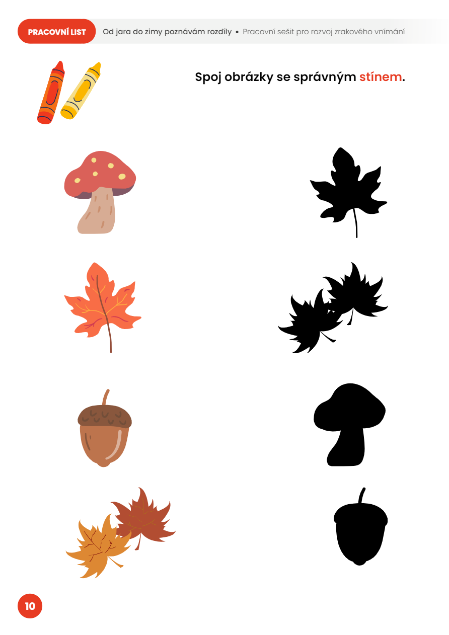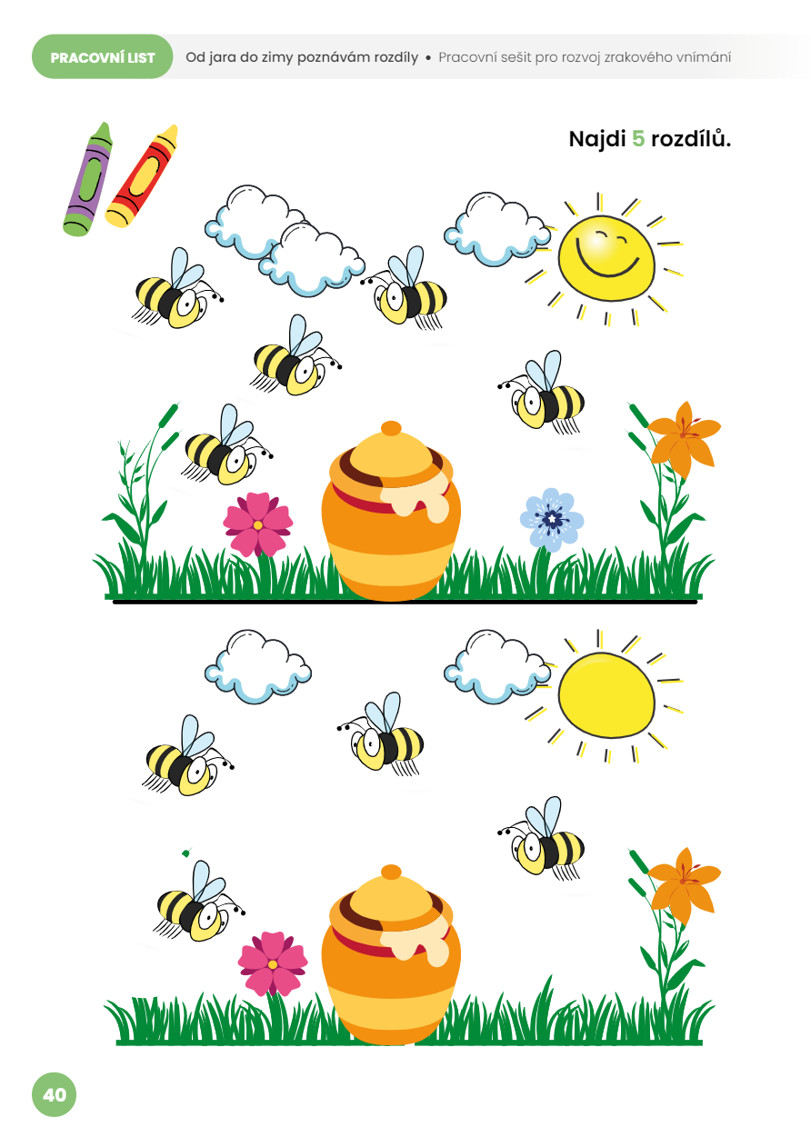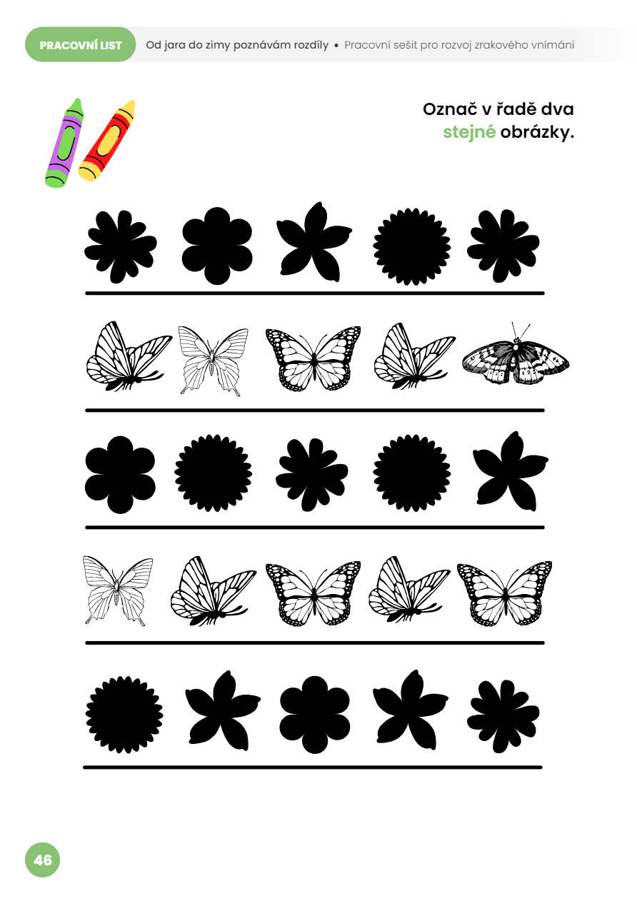 Zrakové vnímání je součástí přípravy na čtení a psaní a jeho rozvoj v předškolním věku je velice zásadní. Jednotlivé pracovní listy jsou jednoduše koncipovány a umožní tak dětem soustředit se na plnění jednotlivých úkolů bez zbytečného rozptylování. Pracovní sešit je rozdělen do čtyř částí podle ročních období od nejjednodušších úkolů až po složitější.