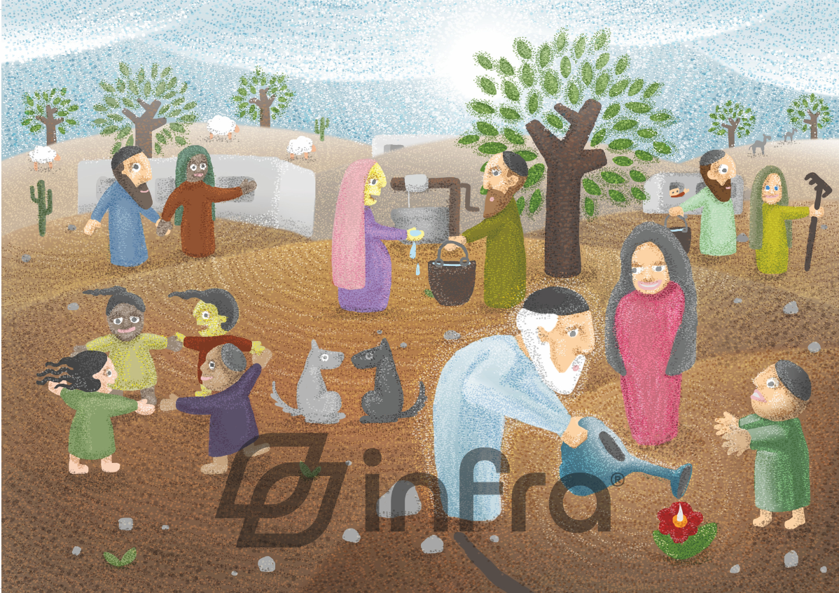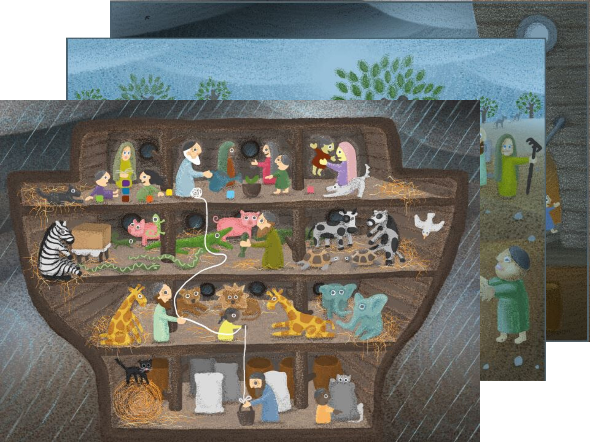 Obrazová knížka příběhu o Noemově upravena do pohádkového kufříku ve formátu A3. Příběh je na 10 obrazech. Na zadní straně každého obrazu najdete text příběhu a příklady otázek, které můžete dětem v průběhu vyprávění pokládat.
