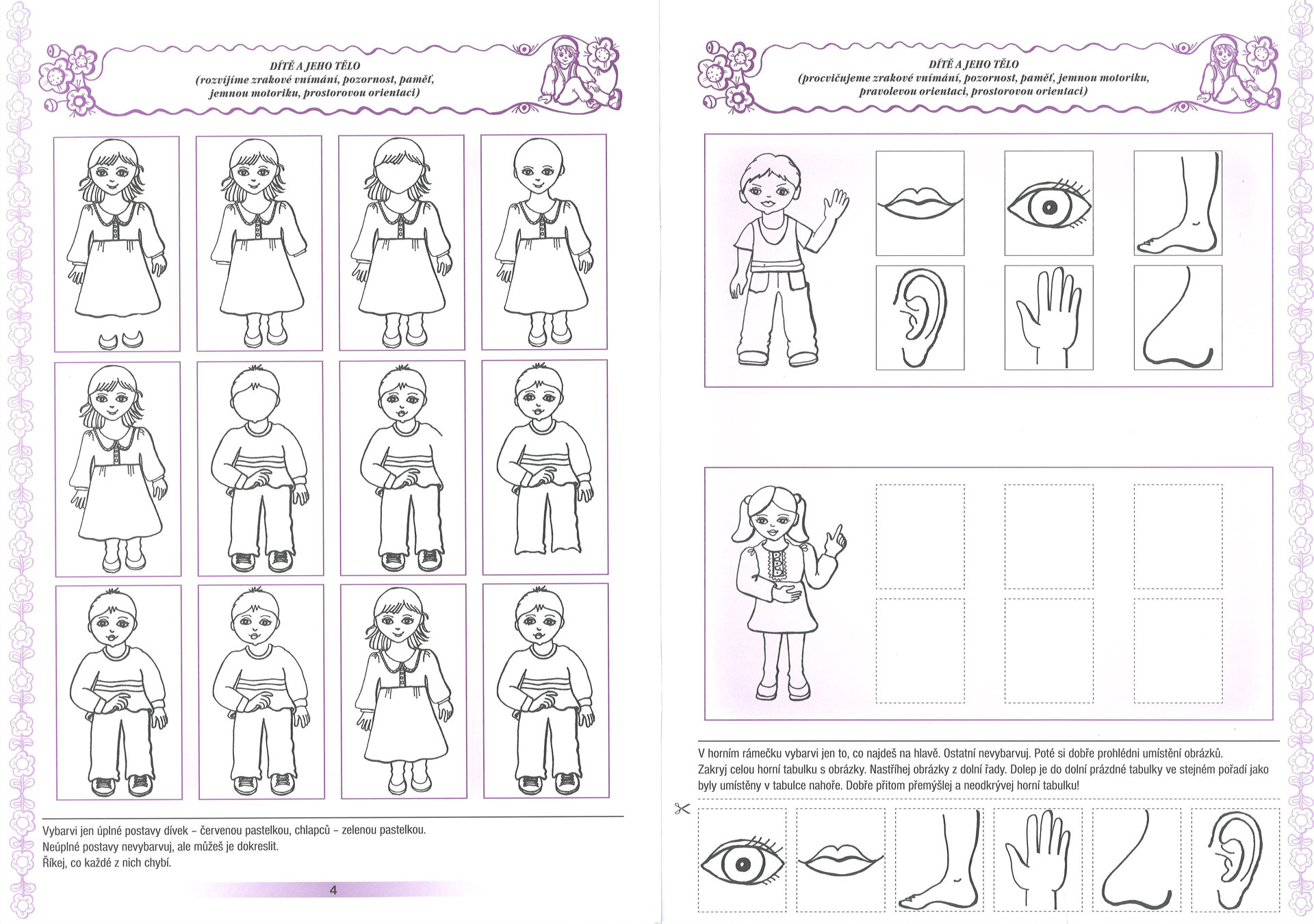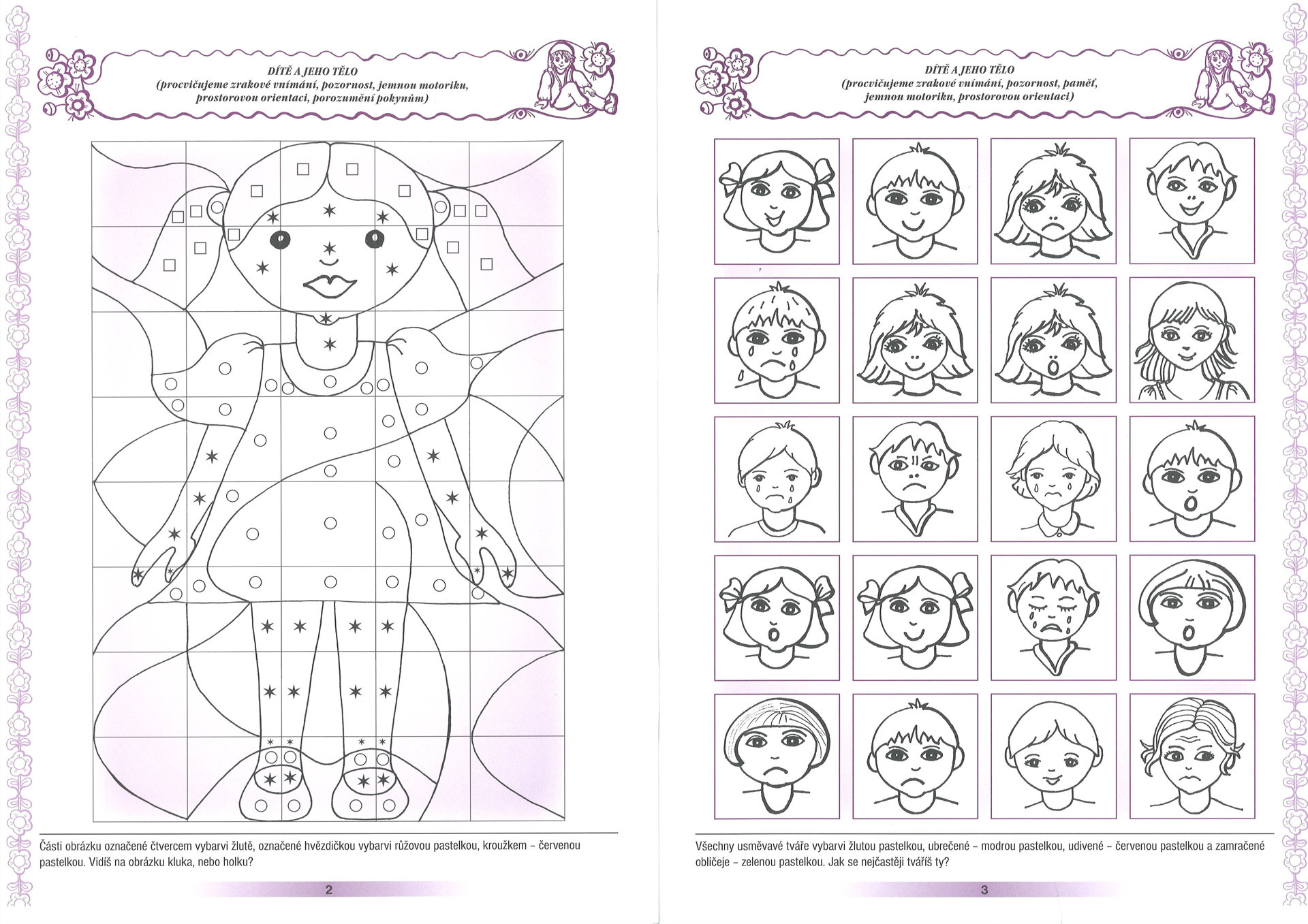 Procvičované oblasti: - soustředění - paměť - jemná motorika - pravolevá a prostorová orientace - sluchové vnímání (rytmus) - zrakové vnímání - řeč (porozumění, vyjadřování, cit pro jazyk, slovní zásoba) - rozvoj myšlení - pochopení vlastní identity - orientace ve světě - orientace v času (roční období).