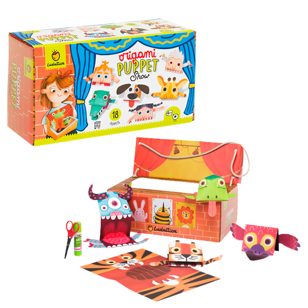 Pevná kartonová krabice, která se promění v divadlo. Uvnitř krabice je lepidlo, nůžky a origami na výrobu 18 loutek.Divadélko se pak pomocí provázku zavěsí na krk.Vhodné pro děti od 5 let.