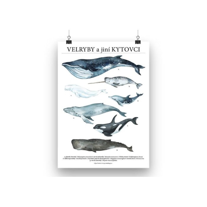 Na plakátu je zobrazeno 7 druhů kytovců (velryb). Ve spodní části plakátu jsou uvedeny názvy všech druhů, jsou ale menším písmem, takže nijak neruší grafické ztvárnění celého plakátu. Plakát je tak vhodný jako dekorace do interiéru i jako výuková pomůcka do školy.
