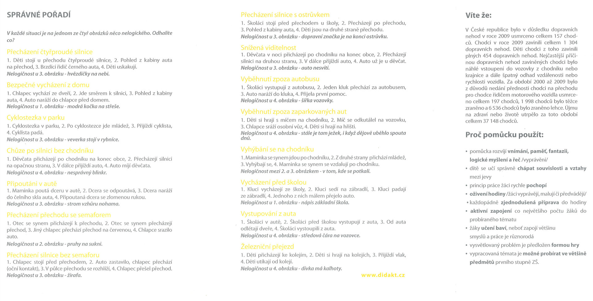 přecházení čtyřproudé silnice, bezpečně vycházet z domu, cyklostezka v parku, chůze po silnici bez chodníku, poutání v autě, přecházení silnice na semafor, přecházení silnice bez semaforu, přecházení silnice s ostrůvkem, snížená viditelnost, vyběhnutí zpoza autobusu, vyběhnutí zpoza zaparkovaných aut, vyhýbání se na chodníku, vycházení před školou, vystupování z auta, železniční přejezd.