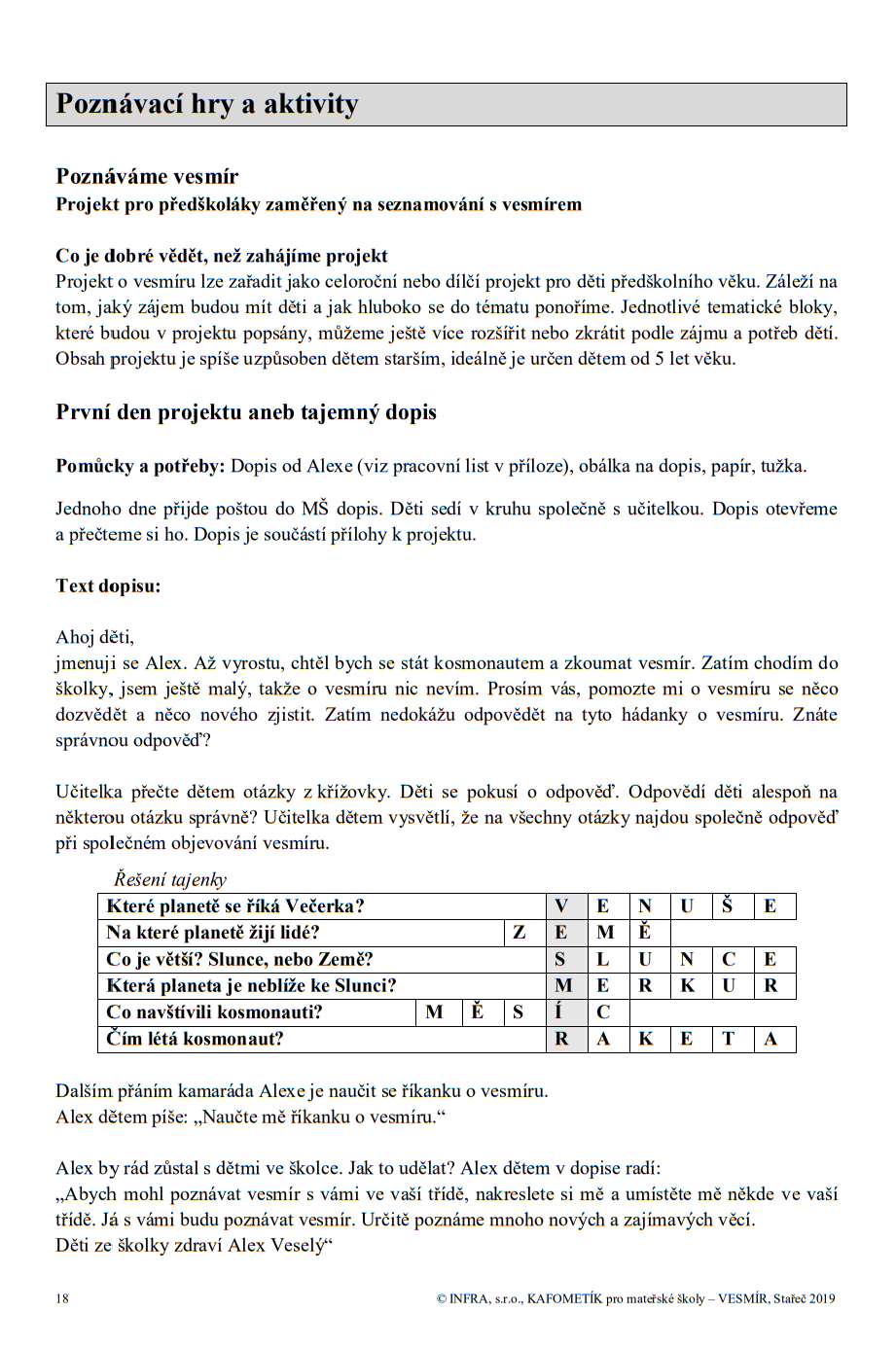 Publikace KAFOMETÍK VESMÍR je soubor metodických a pracovních listů zpracovaných na téma vesmír. Přináší učitelkám mateřských škol mnoho námětů pro rozvoj dovedností dětí - matematickou i čtenářskou gramotnost, řeč, základní vědomosti týkající se tématu vesmír, jemnou motoriku, pohybové dovednosti, fantazii a představivost.