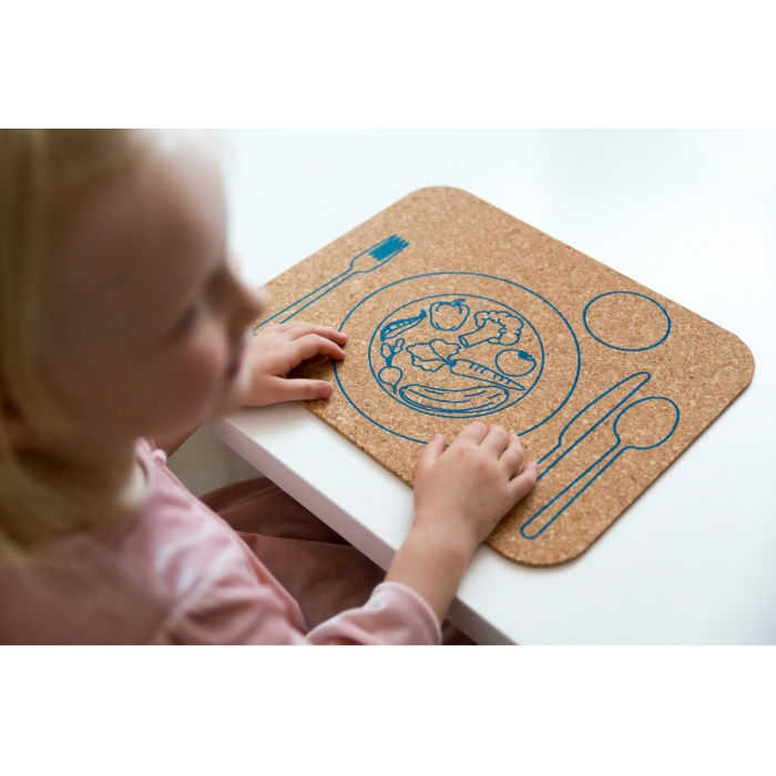 Čistě přírodní korkové prostírání s motivem Zeleninka učí děti základním pravidlům stolování - kam patří talíř, příbor a pohár. Velmi hravou a nenucenou formou si tak dítě osvojuje správné stravovací návyky. Malovaný motiv jim zároveň pomáhá poznávat jednotlivé druhy zeleniny.