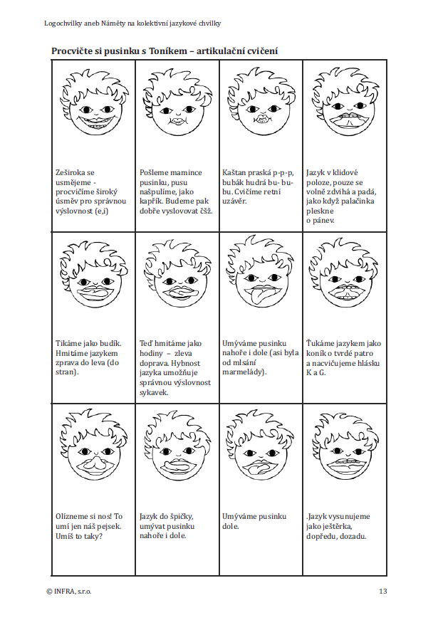 Publikace je ve formátu volných listů A4 volně vložených do kroužkového pořadače. Usnadňuje to práci a přípravu na jazykovou chvilku. Vyjmete si jen tu hlásku, kterou zrovna procvičujete, okopírujete jen ty pracovní listy, které potřebujete.