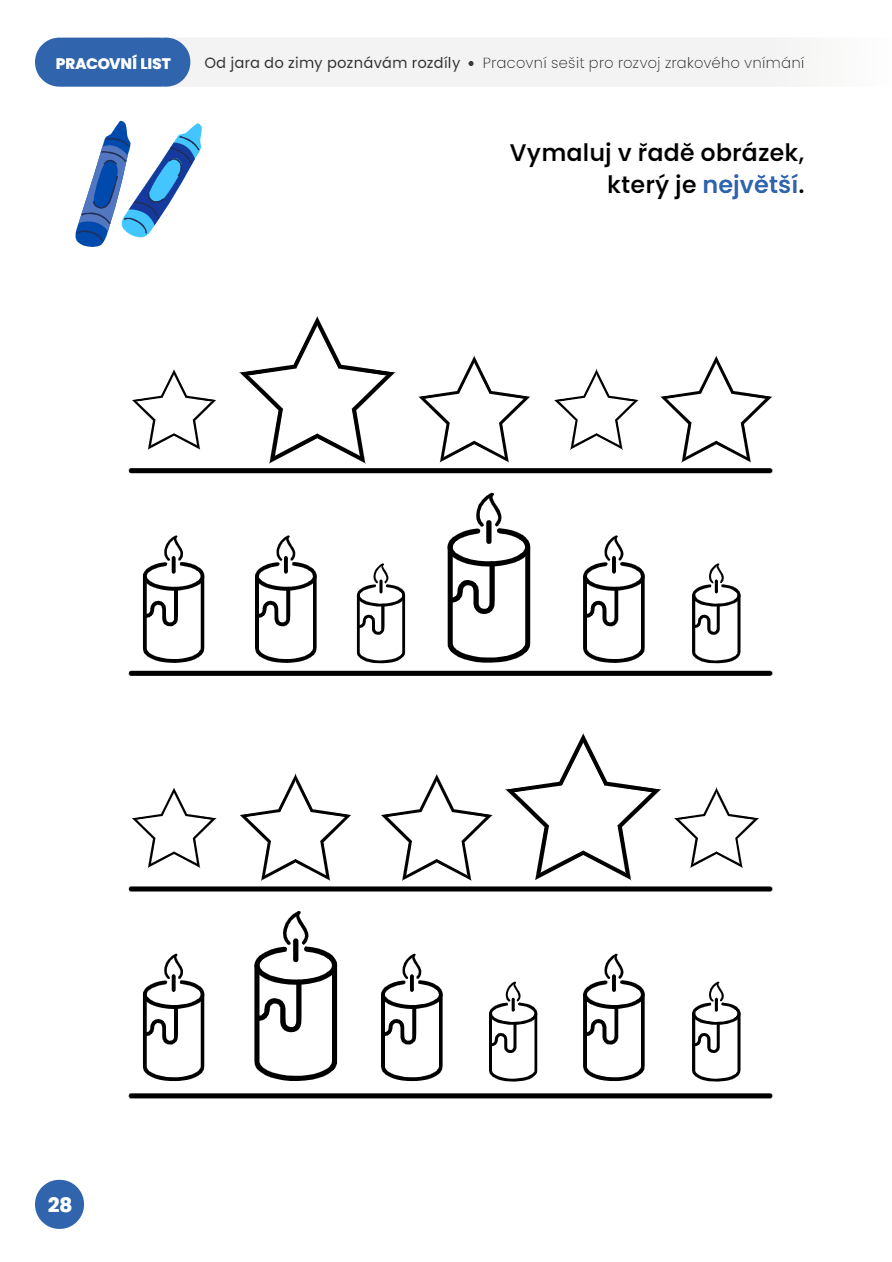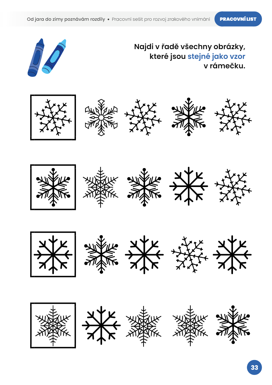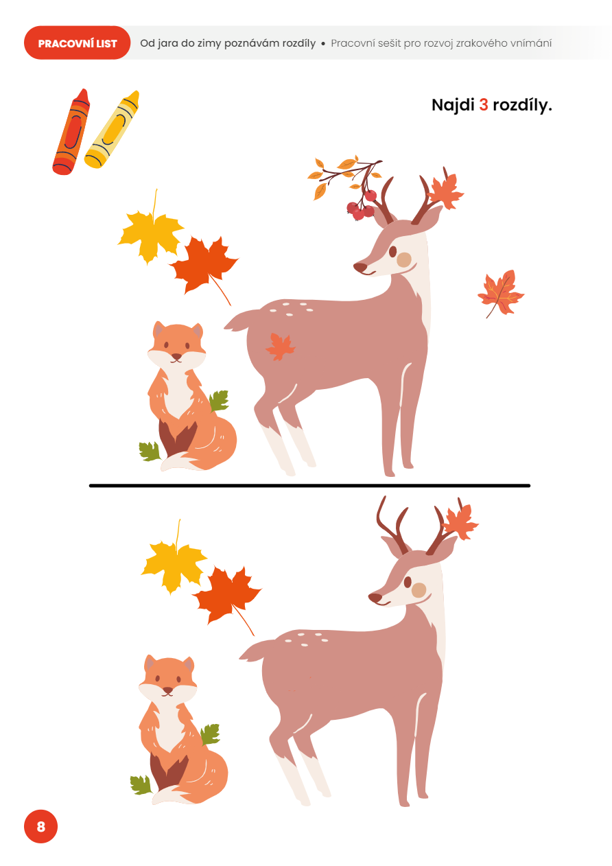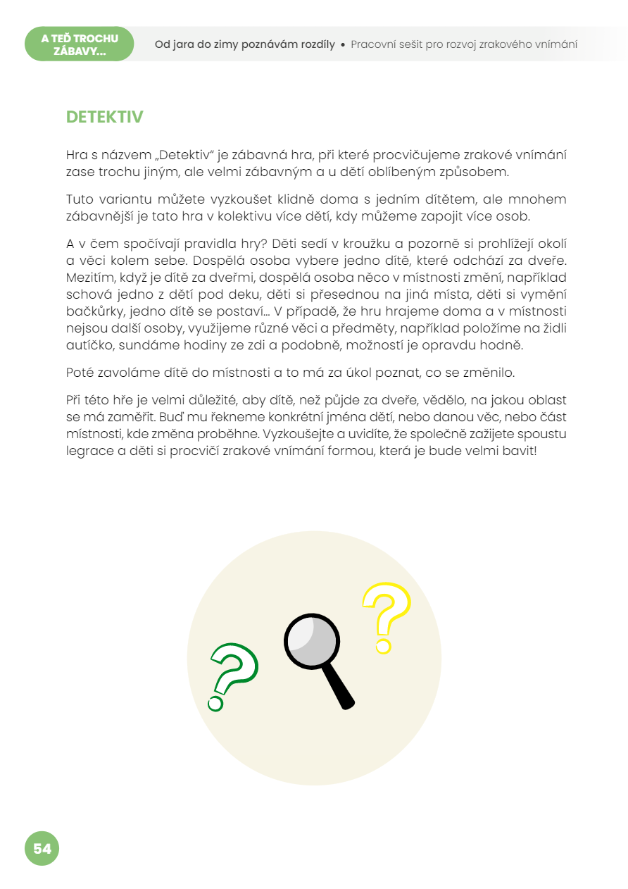 Zrakové vnímání je součástí přípravy na čtení a psaní a jeho rozvoj v předškolním věku je velice zásadní. Jednotlivé pracovní listy jsou jednoduše koncipovány a umožní tak dětem soustředit se na plnění jednotlivých úkolů bez zbytečného rozptylování. Pracovní sešit je rozdělen do čtyř částí podle ročních období od nejjednodušších úkolů až po složitější.