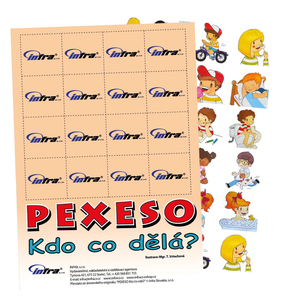 Ilustrace na kartičkách jsou stejné jako na didaktických kartách POZNÁVÁME SLOVESA. Jsou vhodným zábavným doplněním ke kartám.