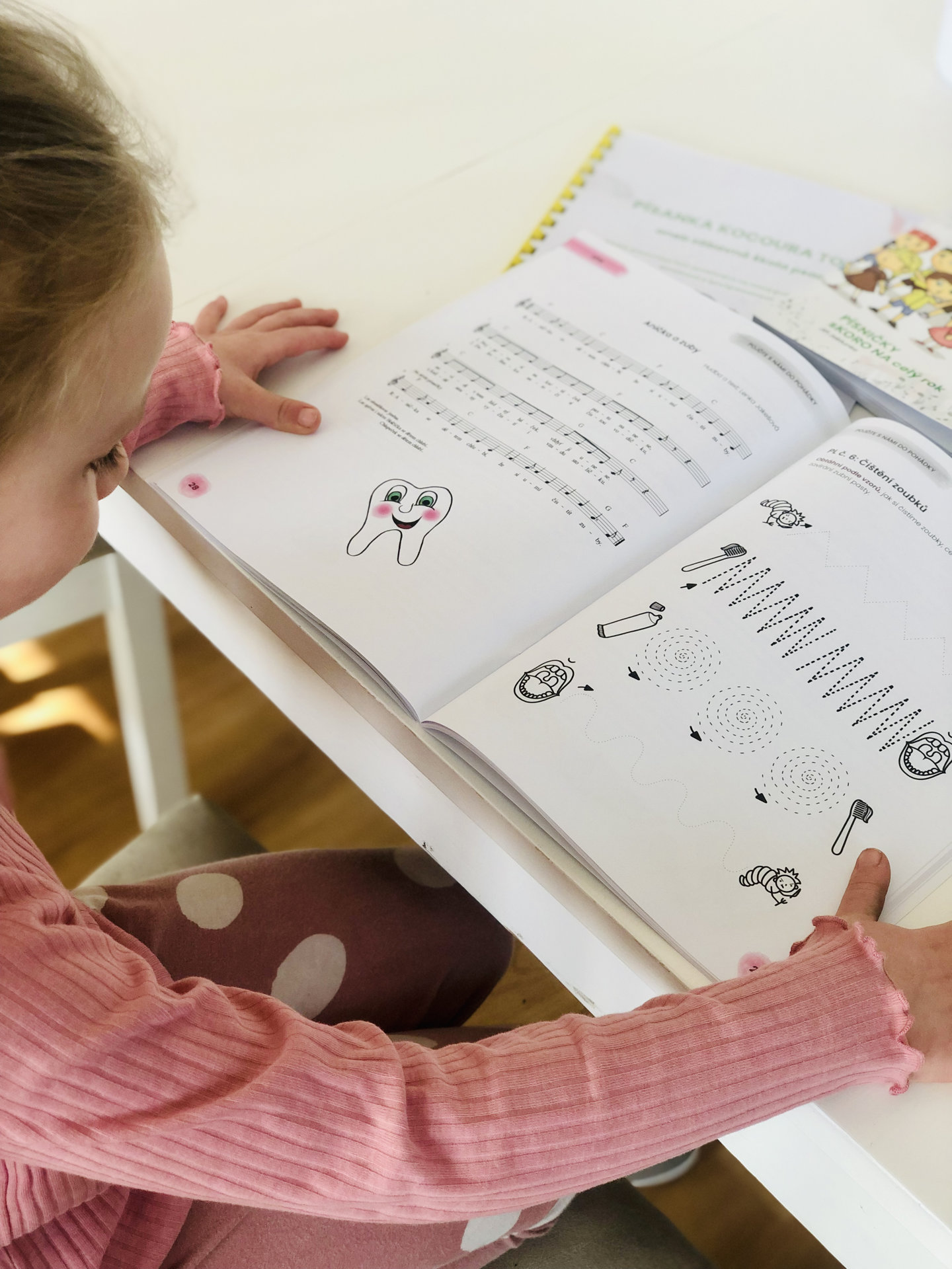 Po pohádce následuje básnička a písnička včetně notového zápisu. Recitací a zpěvem rozvíjíme u dítěte cit pro rytmus a rým. Nechybí ani pracovní listy, kterými procvičujeme grafomotoriku, matematické představy a zrakové vnímání.