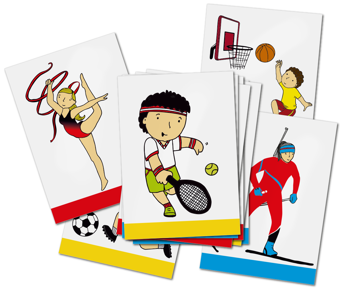 Soubor obsahuje 43 kartiček, které zobrazují sporty, jež lze realizovat v létě, v zimě nebo po celý rok ve vnitřních prostorech. Vybrané sporty a sportovce děti zpravidla dobře znají. Výtvarné ztvárnění karet je dětem svým provedením blízké.