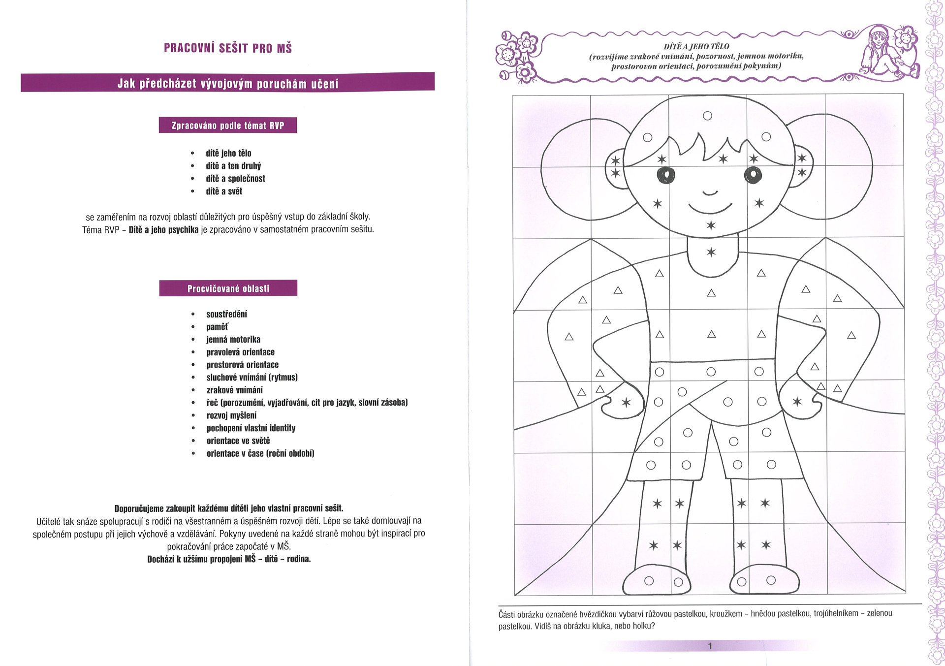 Pracovní sešit – vývojové poruchy je určen pro MŠ a 1. třídy ZŠ. Je zaměřen zejména na oblast RVP – Dítě a jeho psychika.