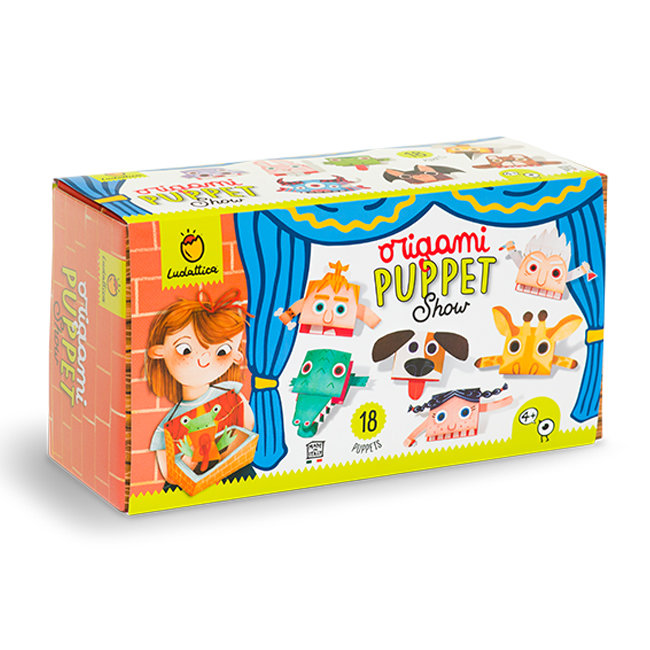 Pevná kartonová krabice, která se promění v divadlo. Uvnitř krabice je lepidlo, nůžky a origami na výrobu 18 loutek.Divadélko se pak pomocí provázku zavěsí na krk.Vhodné pro děti od 5 let.